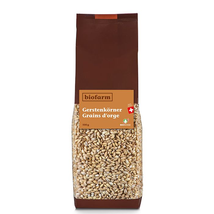 Gerste gehört mit zu den ältesten Getreidearten. Gerste enthält die ernährungsphysiologisch wertvollen Beta-Glucane, sogenannte Polysaccharide die zu den den löslichen Nahrungsfasern zählen. Die angebauten Gerstensorten für Speisegerste haben bespelzte Körner. In der Mühle werden die Körner entspelzt. Für die Biofarm Vollwertgerste wird dabei nur die äusserste Hülle des Korns weggerieben. Gerstenkörner eignen sich als Suppe oder Getreiderisotto.